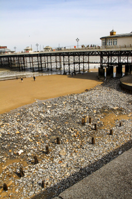 Remains of 18th century defences, 2013There were many other attempts at sea defences, and various jetties, generally to the east of the current pier. West of the pier, after a storm in 2013 a series of timber defences appeared for a while before the sand covered them again. There were visible again in 2023 and the opportunity was taken to cut the tops off three of them for possible dating in case they were part of works from the time of Elizabeth I. However, as they proved to be pine rather than oak, it was concluded that they were probably from the mid-18th century. A picture in Cromer Museum and the plan for the 1846 promenade development supports that conclusion.